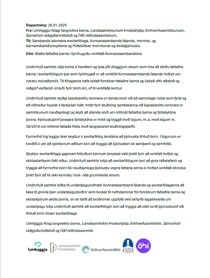 Umhyggja, Þroskahjálp - Landssamtökin Þroskahjálp, Einhverfusamtökin, Sjónarhóll - ráðgjafarmiðstöð ses. og ÖBÍ réttindasamtök hafa sent frá sér ályktun um stöðu fatlaðra barna í fyrirhuguðu verkfalli Kennarasambands Íslands.