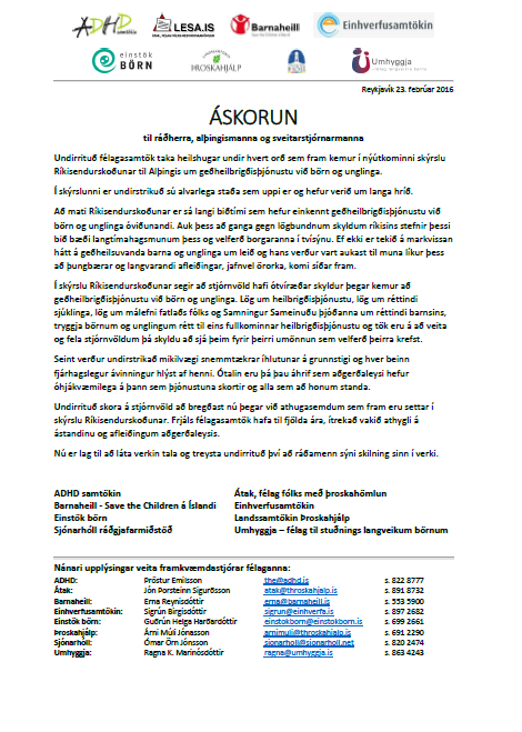 Átta frjáls félagasamtök, sem öll vinna á einn eða annan hátt í þágu barna og unglinga, taka heilshugar undir hvert orð sem fram kemur í nýútkominni skýrslu Ríkisendurskoðunar til Alþingis um geðheilbrigðisþjónustu við börn og unglinga. Félögin skora á stjórnvöld að bregðast nú þegar við athugasemdum sem fram koma í skýrsluni.