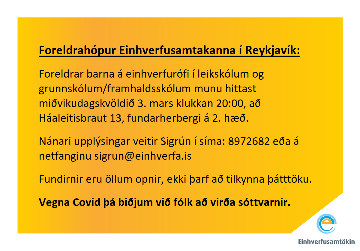 Foreldrar barna á einhverfurófi í leikskólum og grunnskólum/framhaldsskólum munu hittast miðvikudagskvöldið 3. mars klukkan 20:00, að Háaleitisbraut 13, fundarherbergi á 2. hæð.